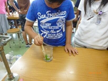 【まずは、日光に当てた葉と当てない葉、2枚の葉を熱湯でしゃぶしゃぶします。】