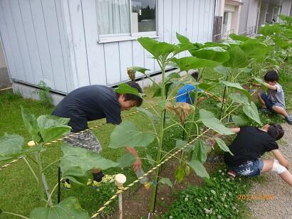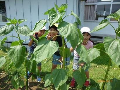特にヒマワリは、もう子どもたちの背丈も超えました。つぼみも出てきました。