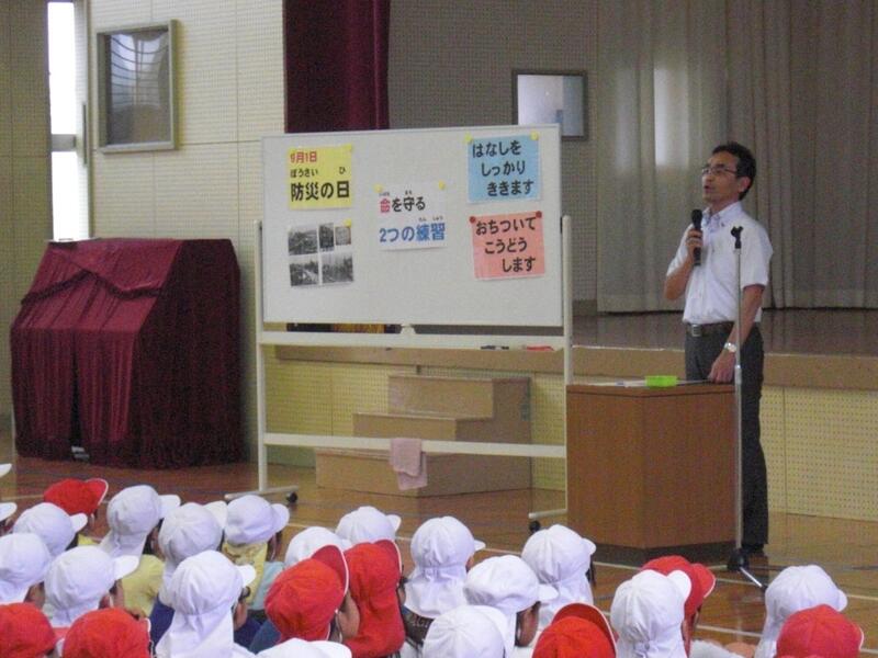 当日はあいにくの雨で体育館への避難となりましたが、避難完了に要した時間は3分程でした。いざというときのために、いつでも、「おはしも」の約束(おさない はしらない しゃべらない もどらない)を守るように、指導しました 。