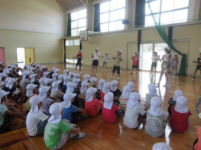 「都農町音頭」は初めて踊る1年生やまだ覚えていない子も、上級生の踊りをまねしながら踊り、だんだん上手に踊れるようになっていきました。