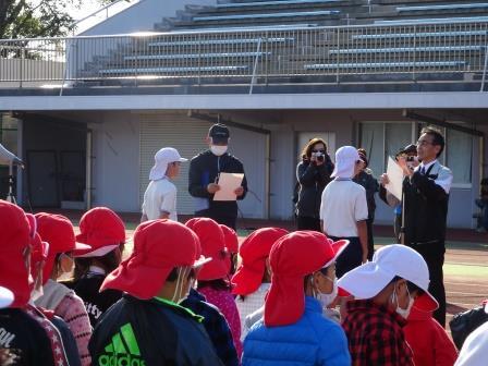 閉会式では、代表で6年生の男女各1位の児童が校長先生から賞状をもらいました。藤見陸上競技場での記録会は、本格的な陸上競技の気分を味わうことができ、来年からも本校の伝統行事となりそうです。