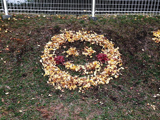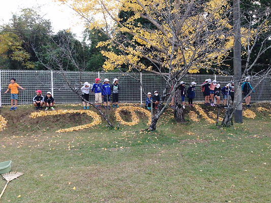 黄色く色づいていた学校のイチョウの木も、12月に入り、たくさん葉を落とすようになってきました。あまりにもきれいなので、何かできないかと考え、4年生が、図工の授業「自然をつかった造形」として落ち葉で文字をかきました。運動場の斜めの土手を利用して描いたので、校舎からも文字を読むことができます。他の学年の子どもたちや先生方からも「すごいね。」「いいね。」と言ってもらえ、みんなが笑顔になるようにとの思いも込めて作った大きな作品に子どもたちも大満足でした。