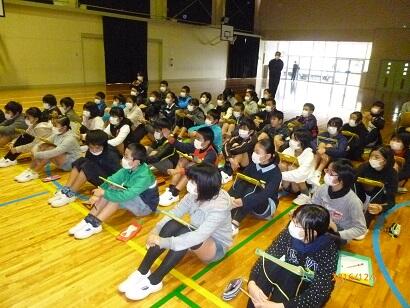 12月6日(火)、3年生の発表集会がありました。まず、二人組で「十五夜さんの餅つき」の手遊びをしました。だんだんと速くなっていくリズムに遅れないように、そして相手との息をぴったり合わせて、手を動かしていました。