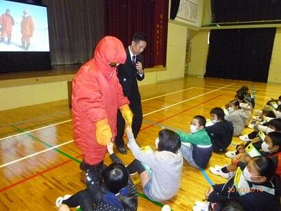 子どもたちの目は最初から釘付けです。「極寒の地」南極大陸の様々な画像、動画、貴重な体験談、2万年前の空気が閉じ込められている氷の溶ける音、防寒着着用体験、風速60mのブリザード体験、あっという間に2時間が過ぎていったようでした。
