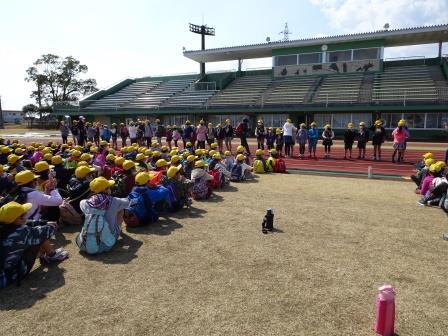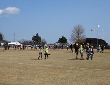 藤見陸上競技場に到着した班から、事前に決めていた遊びをしました。広い敷地をいっぱい使って、楽しそうに子どもたちは走り回っていました。