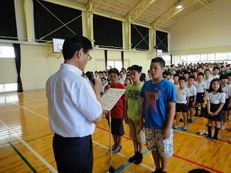 全校朝会では、毎回、6年生のあいさつの素晴らしい子(あいさつ隊長と命名)を選び、代表であいさつの号令をしてもらうとともに、表彰を行っています。