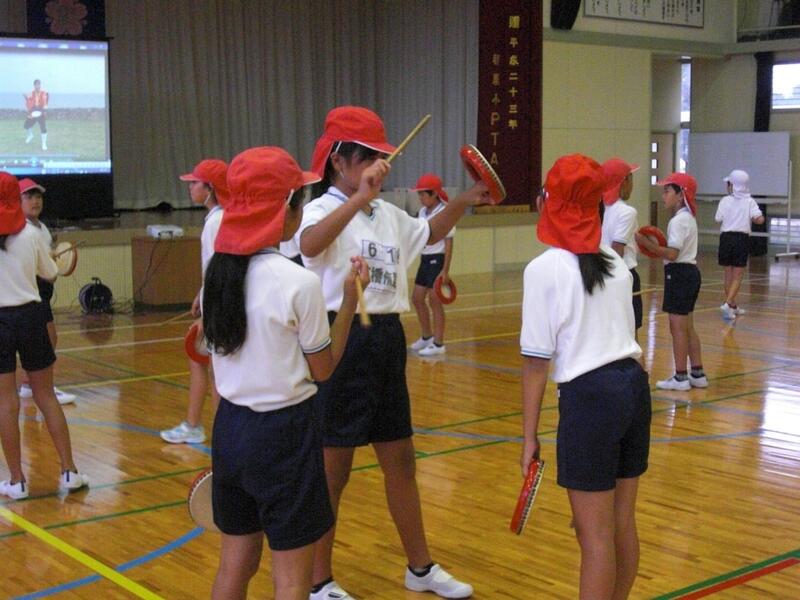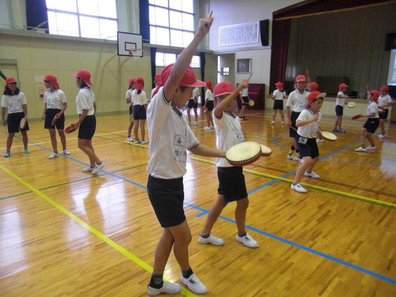 難しい手の動きや回るタイミング、太鼓のたたき方等、丁寧に教えていました。1時間終わる頃には、5年生は目を輝かせ、生き生きと表現していました。こうやって伝統は受け継がれていくんですね。