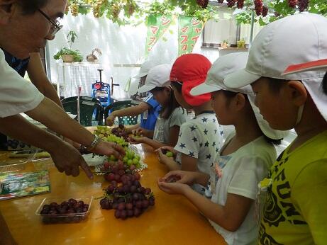 9月6日(水)に、楽しみにしていたブドウ園の見学をしました。説明してくださった河野さん(河野農園)は、毎年、本校の3年生にブドウ作りの仕事を子どもたちに分かりやすく説明してくださっています。今年も、ブドウ作りには、いろいろな道具、特に3種類のはさみを使ってぶどうの手入れをしていること、美しいブドウを作るために努力していることなどを話してくださいました。説明を聞いて、「ブドウを傷つけないようにしているんだな。」「きれいなブドウを作るのは大変だな。」と子どもたちは口々に感想を言っていました。