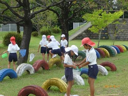 まずは、かわいそうですが運動場に出て、こん虫をつかまえることからです。