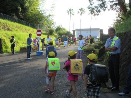 都農小学校は、職員が担当地区の登校時刻に合わせて、それぞれの場所であいさつ運動と安全指導を行いました。遠くから子どもたちの声がこだまするさわやかな朝の光景でした。