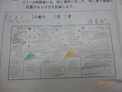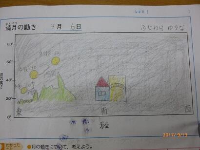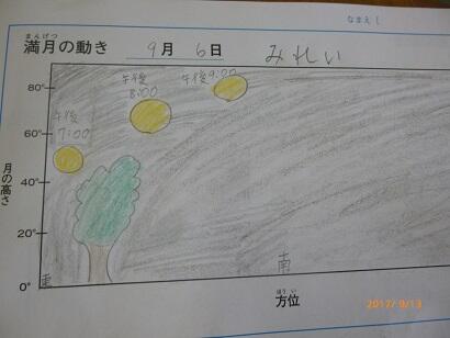 当然、教室では観察できないので、宿題として出しました。でも、さすが理科大好き4年生です。ほとんどの子がこの名月を眺め、観察記録を書いてきていました。「月も星も時刻とともに動いている」ことを実感を伴って理解できたようでした。