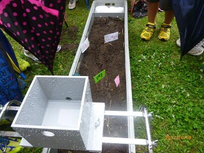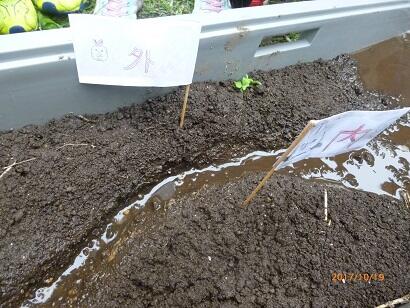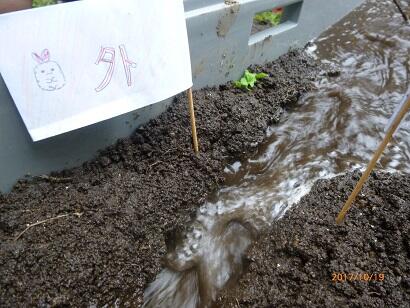 外側は、あっという間に削れて崖ができたことに子ども達は驚いていました。逆に、内側は、砂や土が積もりました。