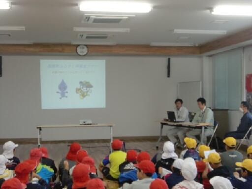 はじめに、水道課の方に飲料水について、住民課の方にゴミの処理について説明をしていただきました。次に、店内を見学し、駅長さんから都農町ならではの販売の工夫や商品開発についてのお話をお聞きしました。子どもたちの事前の質問に丁寧に答えてくださいました。