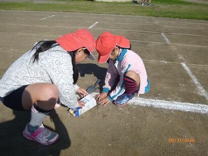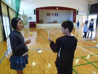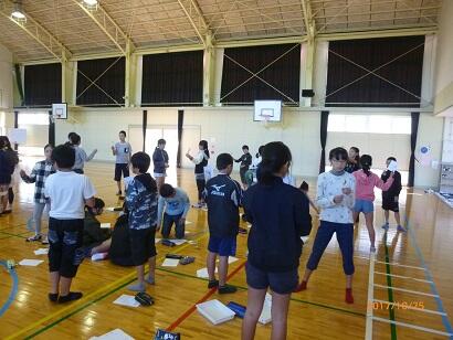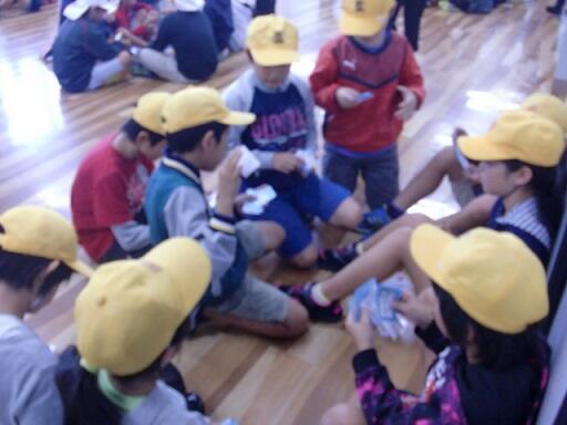 途中で、南小と東小、内野の分校の4年生と自己紹介をかねて名刺を交換したり、ゲームをしたりして楽しく交流しました。