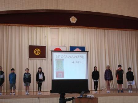 12月7日(木)、人権集会が行われました。放送委員会が、6月、10月の「ふわふわ月間」で作られた「ふわふわ言葉の木」に貼られた「ふわふわ言葉」をもとに、発表を行いました。