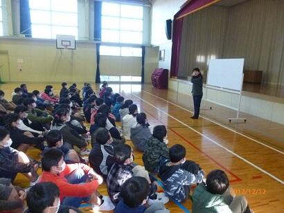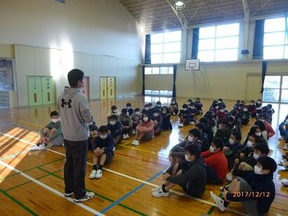「先生のお話」の中心は、冬休みの過ごし方でした。「早ね・早おき・朝ごはん」を心がけること、勉強をがんばること、読書をすること、運動をすること、危ないことはしないことを、みんなで確認しました。