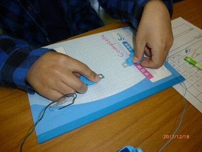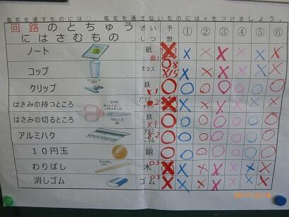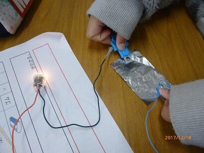 導線と導線の間にものをはさんで明かりがついたということは・・・?電気を通すものだ!