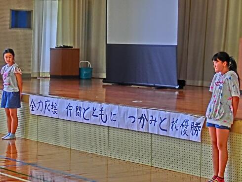 まず、運動会スローガン「全力応援 仲間とともに つかみとれ優勝」が計画委員会から発表されました。全校児童、職員全員で大きな声で読み上げました。