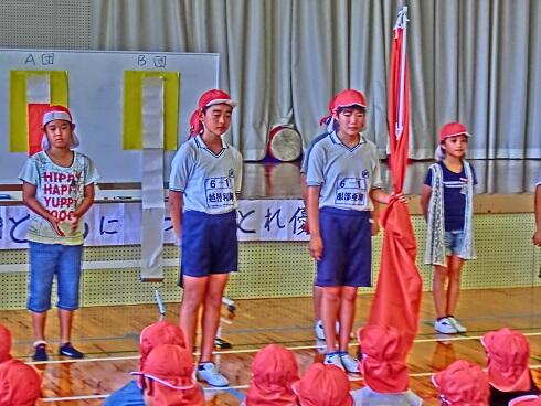 最後に、校長先生からそれぞれの団に団旗が手渡されました。そして、白団と赤団に分かれて、それぞれの団長、副団長、リーダーが運動会に向けて意気込みを大きな声で堂々と発表しました。