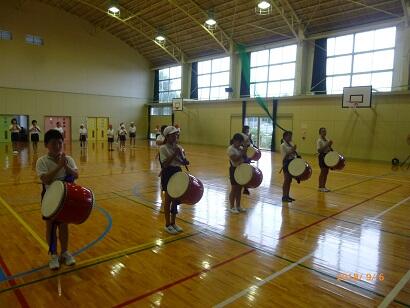 5、6年生が一生懸命、運動会で披露する「エイサー」の練習をしています。いわゆる自主トレというものです。
