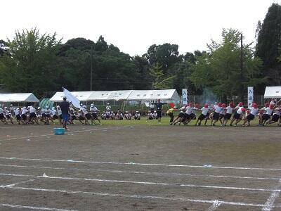 全校団技では、男子と女子に分かれて、綱引きを行います。どちらも綱引きが始まると、みんなで掛け声をかけ、一生懸命綱を引いていました。また、男子が競技しているときは女子が、女子が競技しているときは男子が、団長や副団長、リーダーを中心に、一生懸命応援していました。