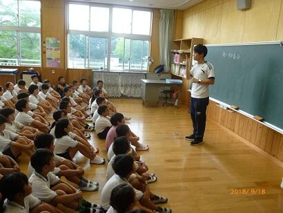 登下校時の安全について関先生が話した後、10月から半年間、勉強のため「宮崎大学」に行く2年1組担任、金丸先生とのお別れをしました。