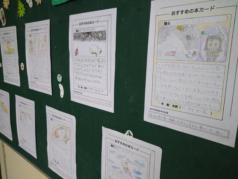 今、図書室前廊下に各クラス1名分の「おすすめ本カード」が貼られています。それらを読むと一冊の本を通して、親子の温かな家読の風景が浮かんできます。今回のおすすめの本は「ほたるとばらのはな」「およげラッコぼうや」「おべんとうしろくま」「なけるいきもの図かん」「はばたけ命!みらいちゃん」「指一本からはじまる手話」「いのちをいただく」「ヤービの深い秋」の8冊(学年順で記載のまま)。そして、下の保護者の欄にはとても温かい言葉が書かれています。「大好きな本の1つです。動物が好きな息子はいろんな動物の話をいつも嬉しそうに聞かせてくれます」 短い時間でもこういう親子の温かな時が流れるってすばらしいですね!