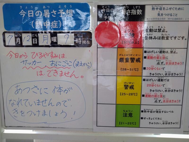 先週1週間は特別校時のため、昼休みなしの早期下校をしていたため、久しぶりの昼休み。「晴れてるし外へGO!」と楽しみにしていた人もいたでしょう。しかし今日は教室など涼しい所で過ごすように放送を入れました。それは熱中症対策です。本校では、保健の先生が昼休みギリギリまで待って、熱中症指数を図り、その数値によって昼休みの過ごし方を判断します。今日の暑さ指数は31を指しました。この数値は「危険」レベルで残念ながら校内で過ごす判断。みんな素直にその放送を聞いて室内でめいめい過ごしていました。これからもこういう苦しい判断が続きますが、室内でどう過ごそうかな、と前向きに考えることも大事です。どんな時でも笑顔を忘れないおすずっ子ならできますね。