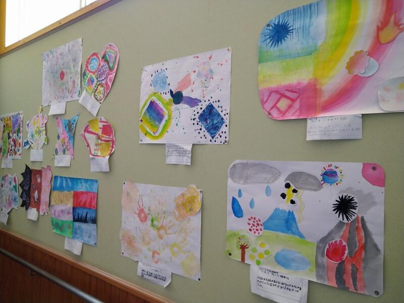 5年生教室につながる階段に、「心のもよう」という絵が貼ってあります。それぞれの絵から心の形が伝わってきます。ある絵のコメントには「4つの感情一つ一つを考えて表現しました。悲しい所は雨に表し、うれしい所は虹と太陽に表しました」とありました。発想力豊かな絵で、つい写真を撮りました。