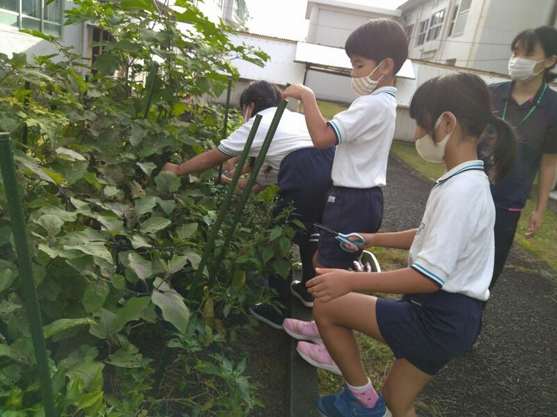 今朝、2年生の学級園では野菜の収穫をしていました。1学期から、用務の先生と一緒に2年生が育ててきたナスやピーマンがすくすく育ち、今月、2クラス輪番で収穫しています。栄養と愛情が行き届きすぎて(!?)、ビックサイズのナスも…。もうすっかり収穫の秋ですね!