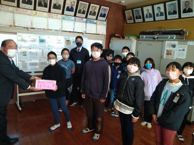 23日、社会福祉協議会の方に来校いただき、校内で呼びかけた歳末助け合い募金の贈呈式をしました。募金は25,706円集まり、ずっしりと重い募金箱をみんなの真心とともに送りました。温かい協力をいただいた皆さん、本当にありがとうございました。