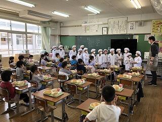 4月6日(金)給食スタート!2年生の様子です。5年生が、準備のサポートに来てくれて手際よく準備をすることができていました。おかずのつぎ方や配膳の仕方を教えてくれた5年生に感謝です。4月12日から1年生の給食が始まります。