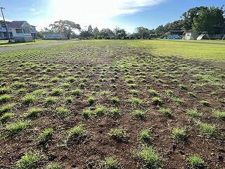6月24日(金)運動場の芝生は、順調です。ところどころに麦が芽を出してきましたが、みんなで移植して校舎横に小さな麦畑ができました。