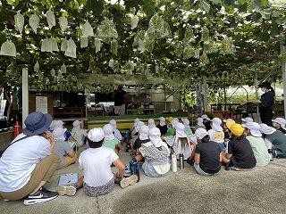 9月2日(金)に、3年生は社会科の授業で、ブドウを生産販売されているKAWANO農園の見学に行きました。あいにくの雨でしたが、町のマイクロバスに乗って出かけました。農園では、使う道具の説明を聞いたり、実際にブドウのビニールハウスを見学したりしました。収穫前のブドウを沢山見て、農家の方々の工夫や苦労していることをたくさん聞くことができました。そして、最後にはブドウの試食が!!子ども達からは、笑みがこぼれ美味しそうに食べていました。