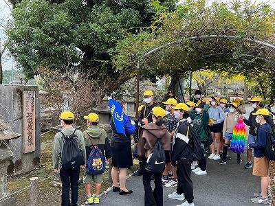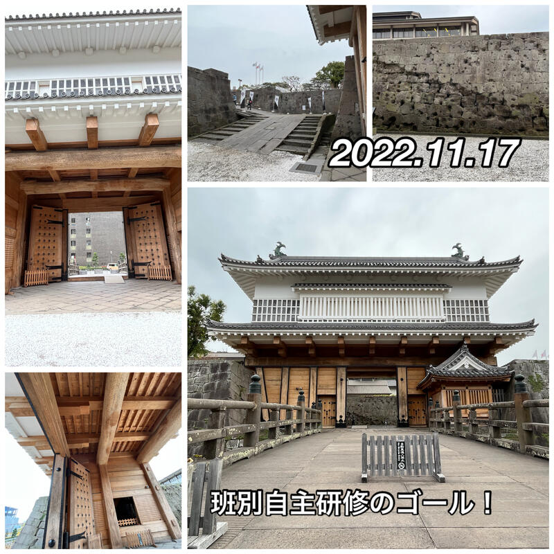 班別自主研修に入っています。ゴール地点の黎明館は、2年前に完成した立派な門ができています。