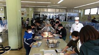 午前中の活動で、おなかペコペコになりました。センター食堂での昼食の様子です。バイキングでは、何回もおかわりをする子達がいました。