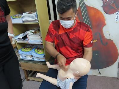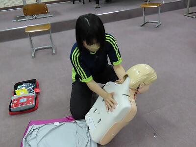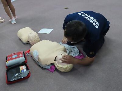 *胸骨圧迫(心臓マッサージ)30回と人工呼吸2回の組み合わせを絶え間なく続けます。