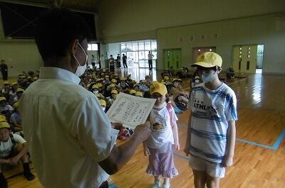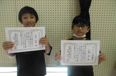昨日の全校集団下校で、「あいさつ名人」と「ボランティア賞」の表彰を行いました。