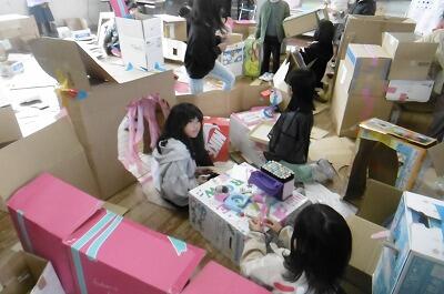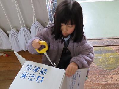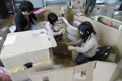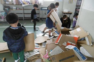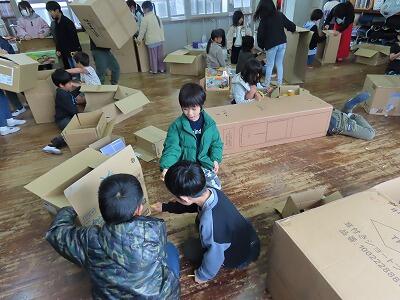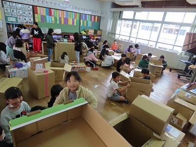 めあて「ダンボールに入ったり、大きさを考えたりしながら作ってみよう」
