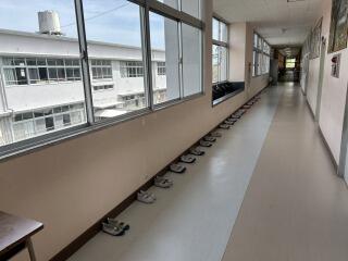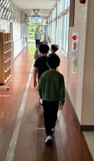 1年生教室横のろう下は、長い一直線になっているので、つい走りたくなるようです。しかし、その衝動をコントロールしないと衝突事故が起き、子どもたちの身の安全を確保することが難しくなります。