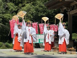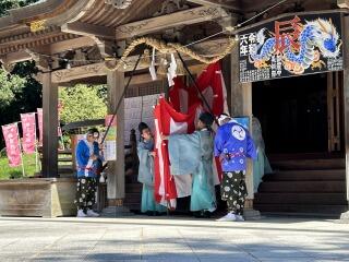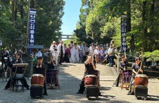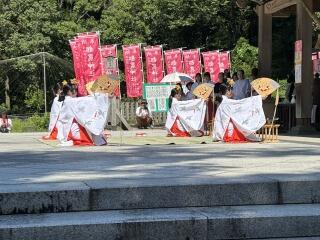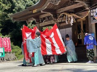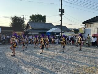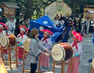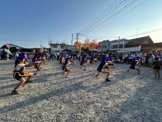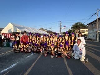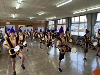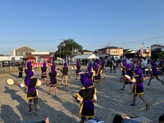 赤木邸に設置された御旅所にお神輿が到着し、初日最後の神事が終わった後、本校6年生のエイサーが奉納されました。
