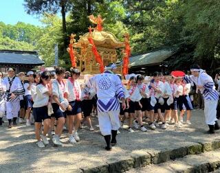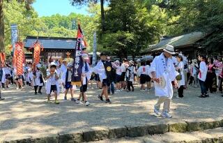都農中学校3年生が担いだお神輿が出発していきました。お神輿を先導する旗持ちには、町内各小学校の子どもたちの姿もありました。