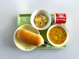 今日はシェルマカロニという貝殻の形をしたマカロニを使用しました。また、今日はバーガーパンを出していますので、パンに照り焼きパティとゆでキャベツをはさんで、ハンバーガーにして食べてください。中身がこぼれないように、お皿の上で上手に食べましょう。