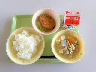 ゆでキャベツのシャキシャキとした歯ごたえと、牛肉コロッケの衣のサクッとした歯ごたえの違いを楽しめました。具だくさんの豚汁で元気もりもりです。