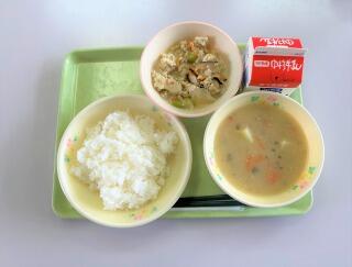 今日の給食一口メモには、野菜のごま汁にはたっぷりのごまが入っているとありますが、ごま以外の野菜もたっぷり入った具沢山のごま汁でした。