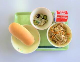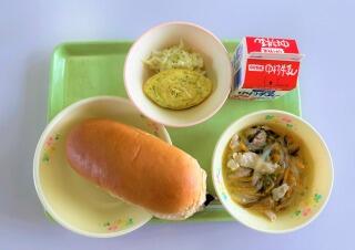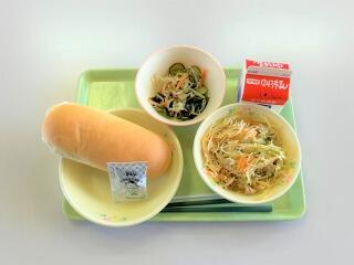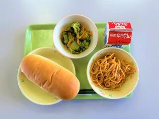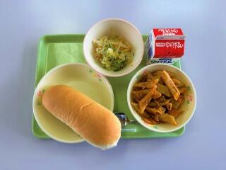 給食一口メモにもありますが、学校給食用のパンはシンプルな味付けになっているので、主菜の「ペンネのミートソース」とよく合います。