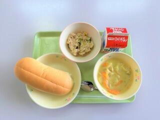 今日のサラダに使用しているキャベツも3回ずつ洗っているのですが、丸ごと洗うわけではなく、キャベツの葉をはいで、1枚の葉っぱにつき3回ずつ洗っているのですよ。丁寧な作業をして給食を作ってくださる調理員さんに感謝して、給食をいただきましょう。