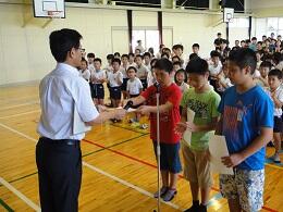 全校朝会では、毎回、6年生のあいさつの素晴らしい子(あいさつ隊長と命名)を選び、代表であいさつの号令をしてもらうとともに、表彰を行っています。