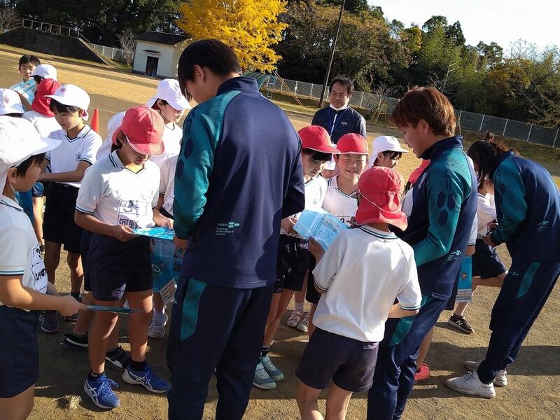 昨日から2日間、ヴェロスクロノス都農のサッカー選手が来校し、3~6年生の持久走練習とミニゲームを通して交流しました。子どもたちは地元の有名人に生に出会いと運動スキルの高さに感動しながら、スポーツの楽しさを体感したようです。授業の最後には人権に関するクリアファイルをいただき、人権集会を終えたばかりの子どもたちにはとてもタイムリーでした。学年によってはサイン会も…笑顔いっぱい、元気いっぱいの姿を目にして、こちらも嬉しかったです!ありがとうございました。