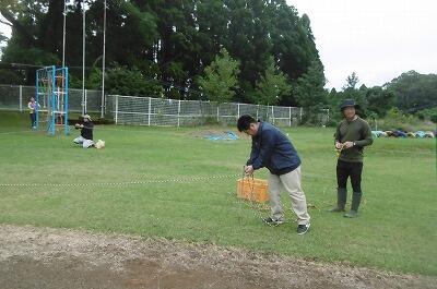 テント立て、万国旗はり、駐車場設定・表示、くい打ち等たくさんの作業をしていただきました。
